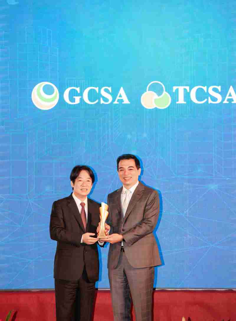 达全方位永续表现获全球永续奖及台湾永续奖肯定,,,由副总统赖清德颁奖 (左),,,,28国际总经理柯富仁 (右) 代表领奖