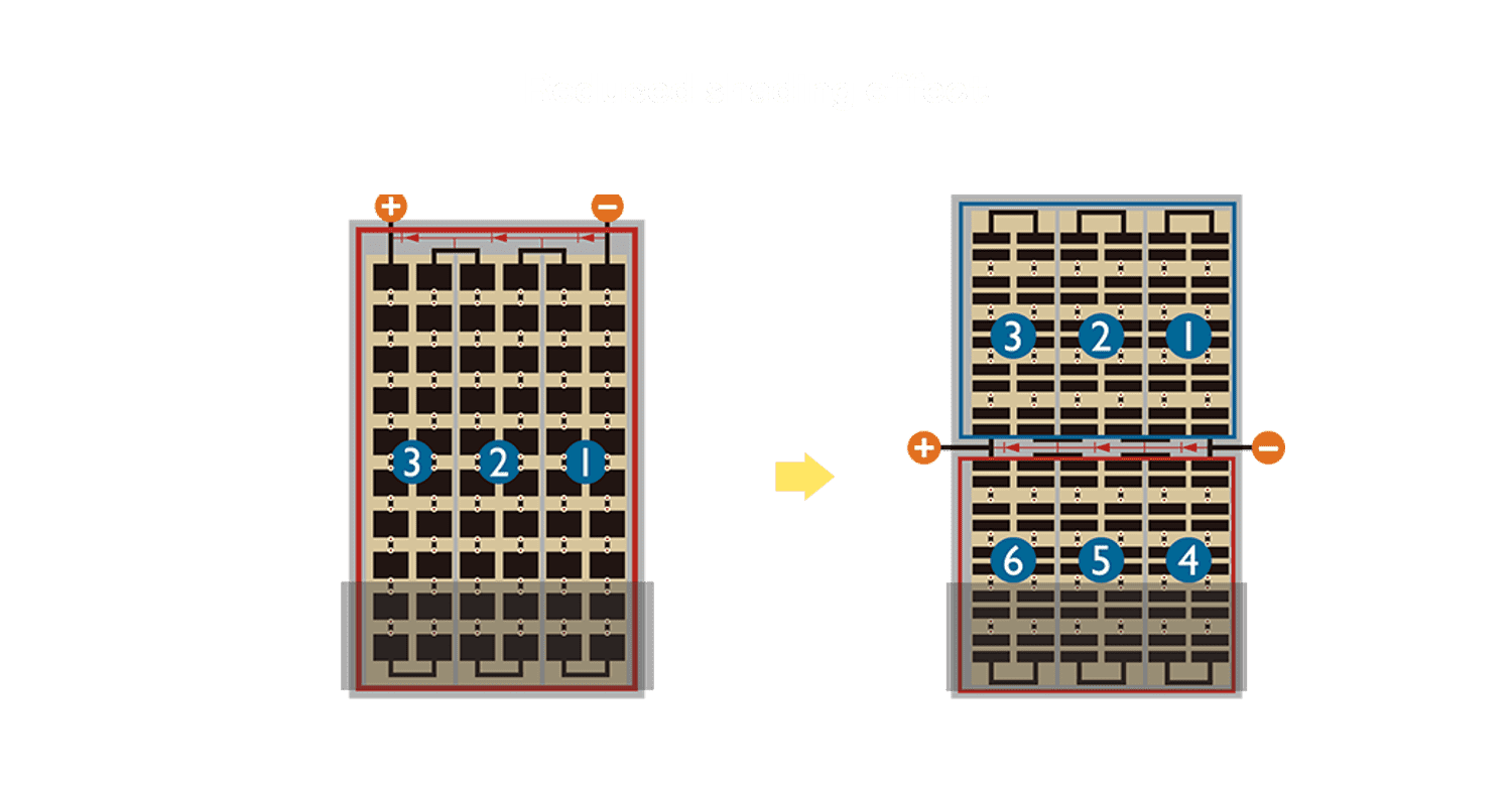 - 电池使用多条铜导线 (Copper wire) 于电池片上形成较短的电流路径,,提高电流收集效率,,,采用圆形设计的铜导线较传统扁平式的铜焊带 (Ribbon),,可增加入射至电池的光线量。。。。