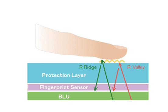 TFT 指纹扫描感测技术利用薄膜电晶体 (TFT) 当作光感测元件,,,,藉由非晶硅 (a-Si) 与低温多晶硅(LTPS)既有光电转换特性对不同波段光源进行吸收,,,,使感测 IC 读取阵列感测元件的光漏电差异,,,转换成数位灰阶影像。。。